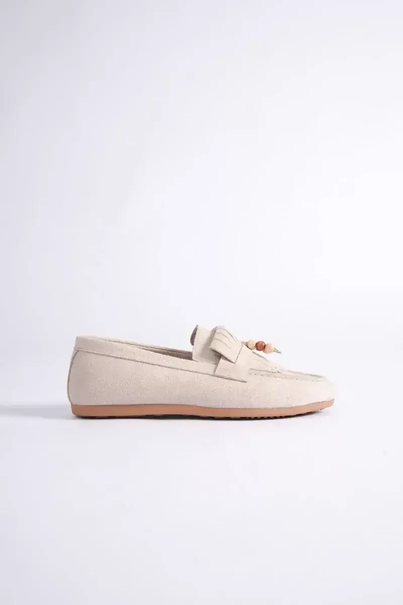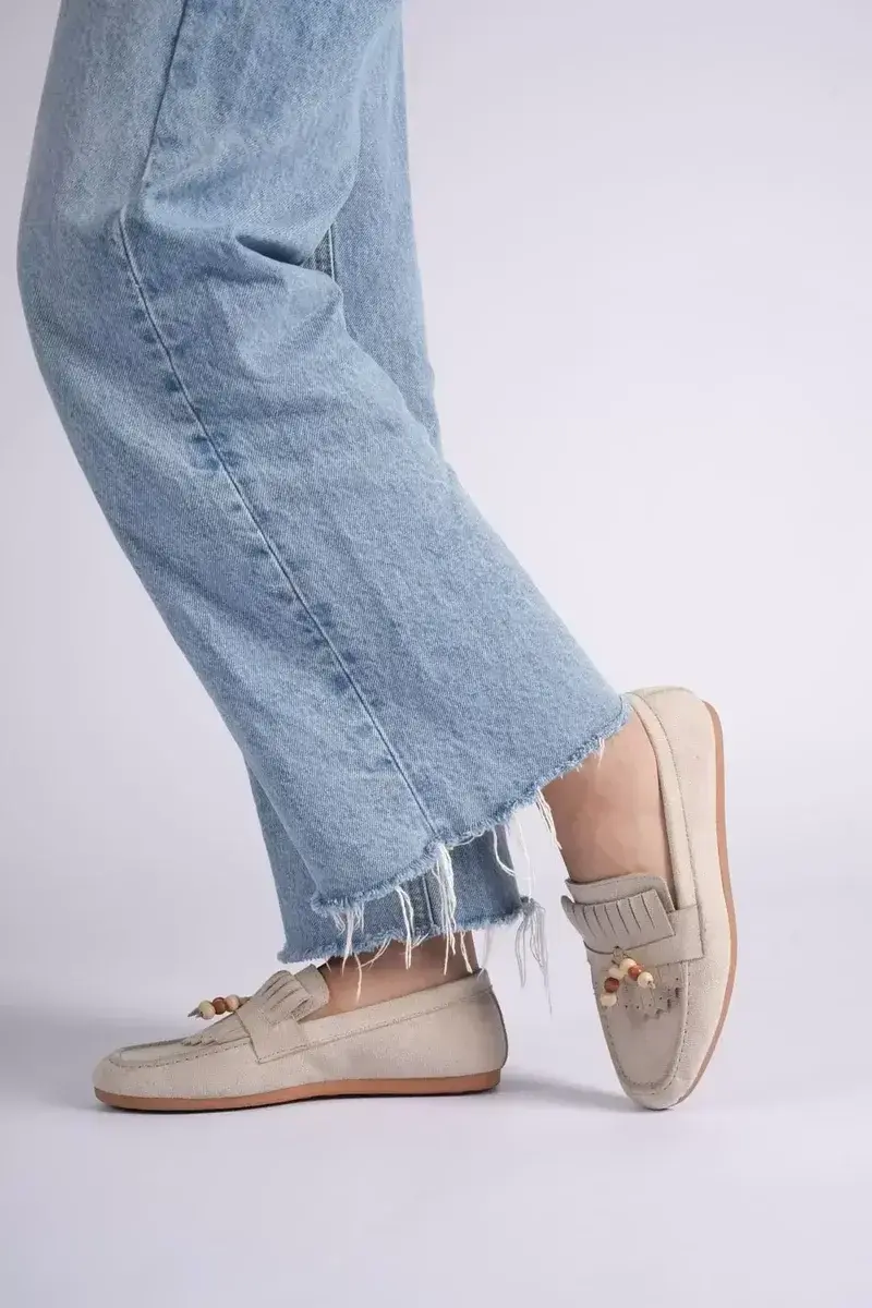 ✨ BUCCA Kadın Krem Süet Püskül Detaylı Günlük Loafer Ayakkabı