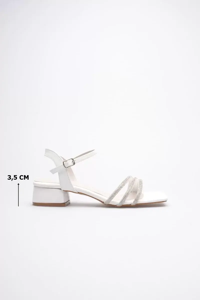 Beyaz tonun temiz ve modern görünümü, taş detaylı ince bantlarla birleşerek ayağında zarif bir parıltı oluşturur. Bilek bantlı yapısı sayesinde konforlu ve güvenli bir kullanım sunarken, kısa topuk tasarımı gün boyu rahatlık sağlar.