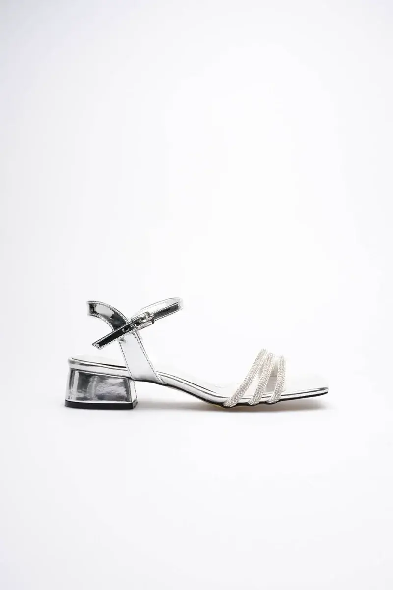 BUCCA Kadın Gümüş Işıltılı Taş Detaylı İnce Bantlı Topuklu Sandalet