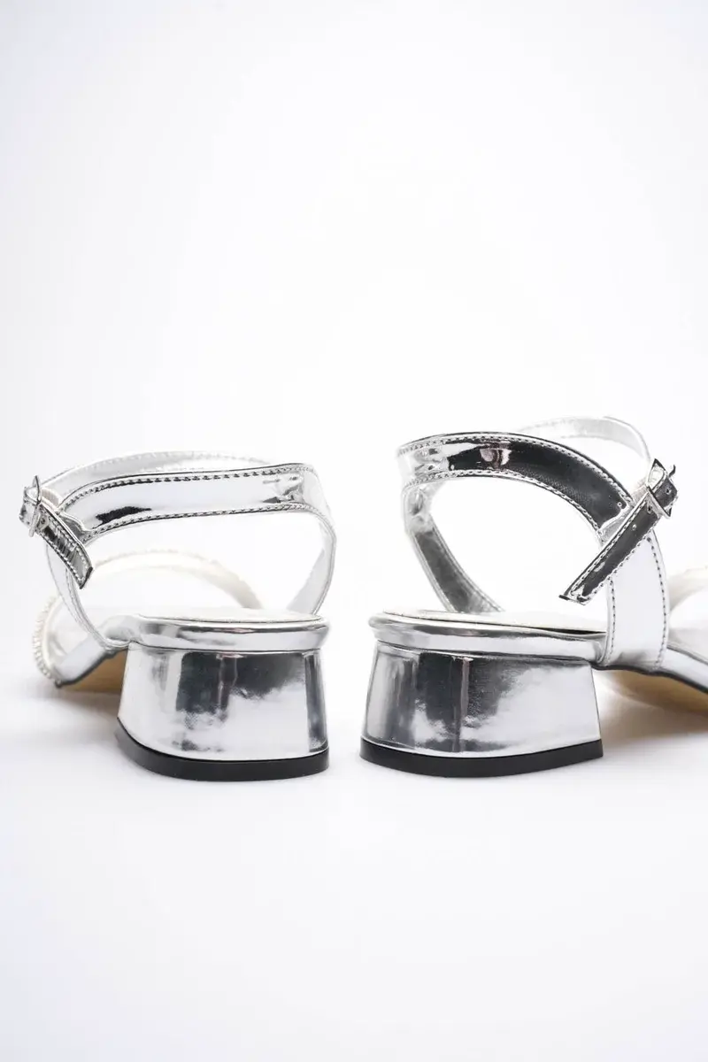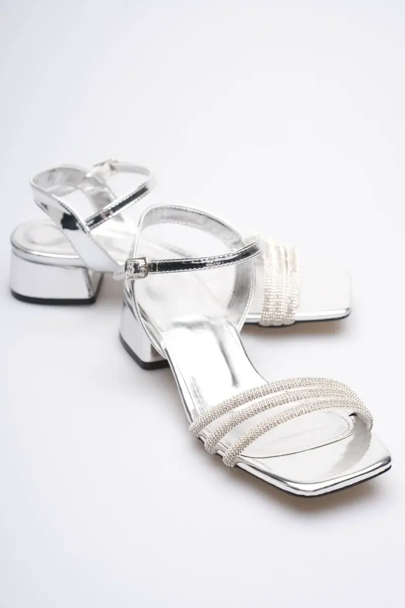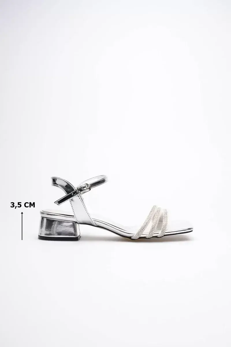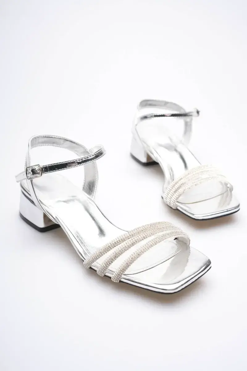 Gümüş tonun modern ve ferah görünümü, taş detaylı ince bantlarla birleşerek ayağında zarif bir parıltı oluşturur. Bilek bantlı yapısı ile güvenli ve konforlu kullanım sunarken, kısa topuk tasarımı gün boyu rahat bir şıklık sağlar.