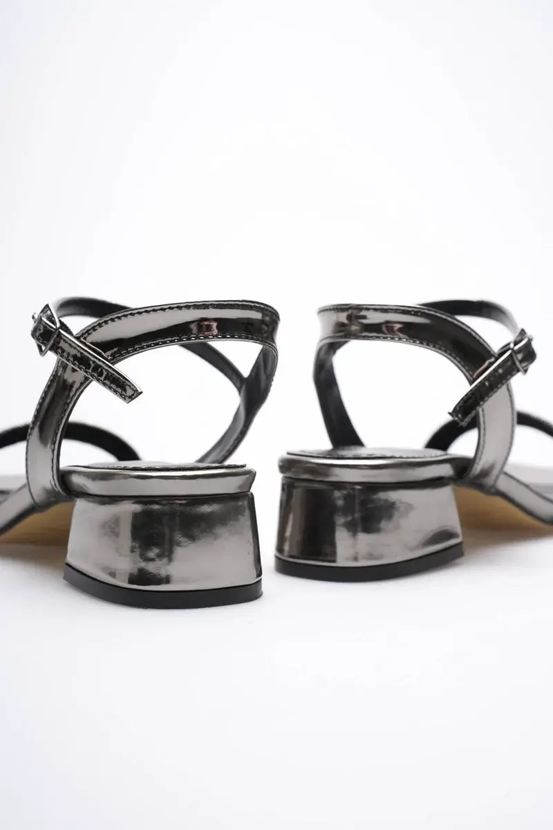 Parlak gümüş yüzeyi ile dikkat çekerken, ince bant üzerindeki taş detayları ayağında adeta mücevher etkisi yaratır. Zarif bilek bandı ve kısa topuk yapısı sayesinde hem estetik hem de konforlu bir kullanım sunar.