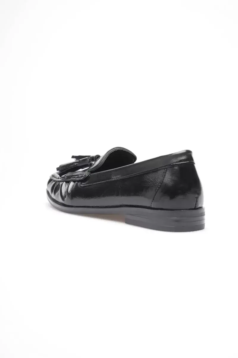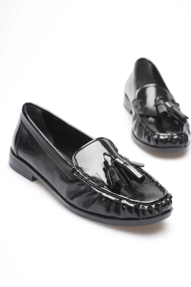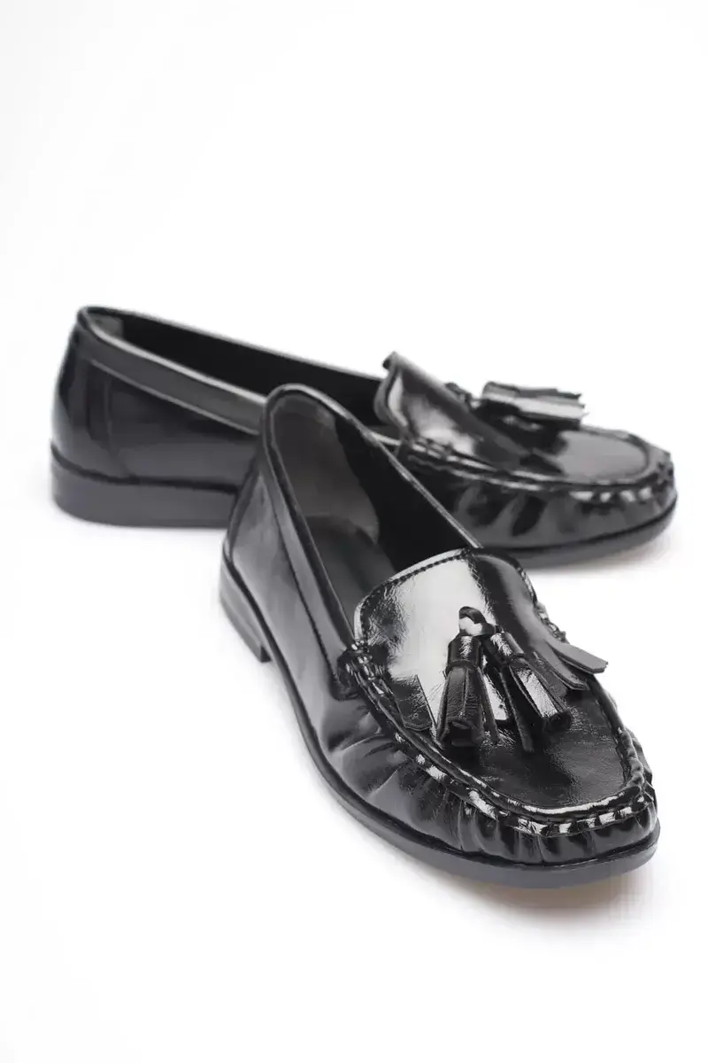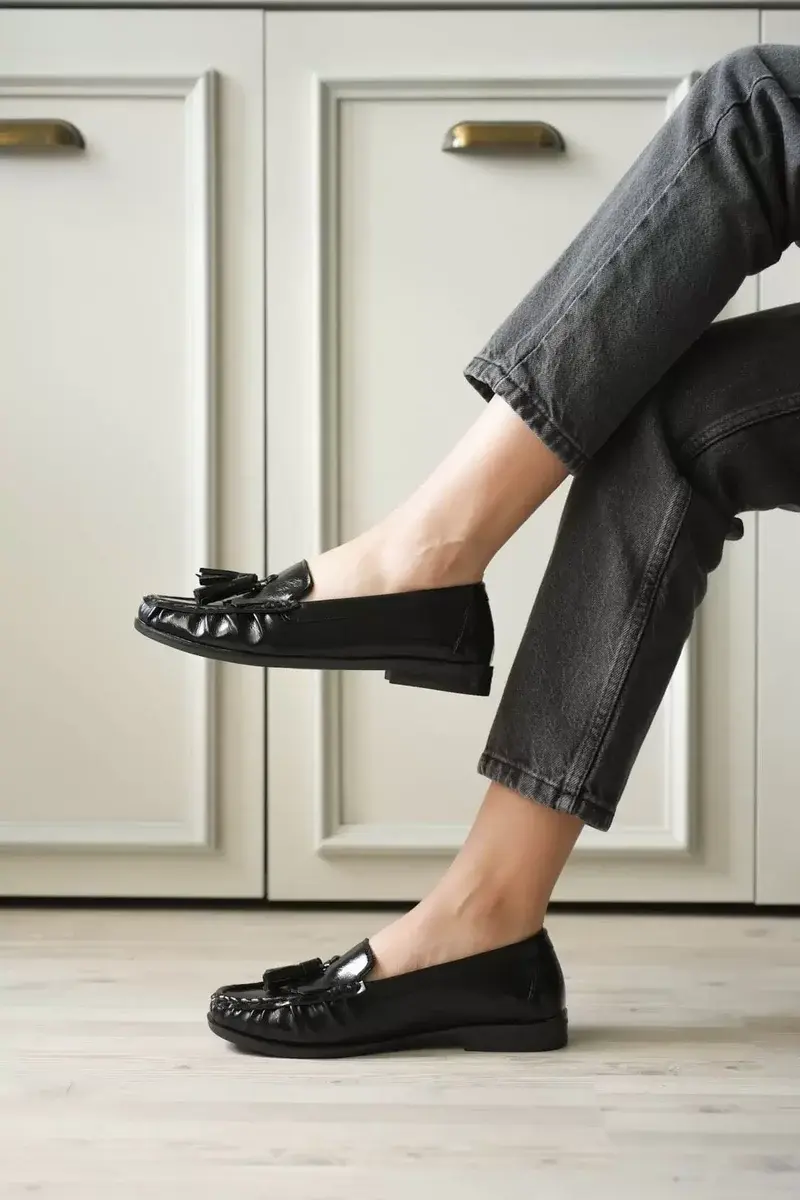 Kadın Siyah Rugan Püsküllü Loafer Ayakkabı